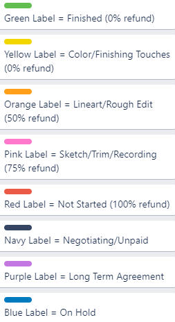If I cannot finish your commission for any reason, I will issue a refund. The amount refunded will depend on the progress of the commission (see the label chart below). Please do not open a dispute with PayPal before speaking with me first. I promise to work with you, and it will ultimately be easier than dealing with PayPal (for both of us).